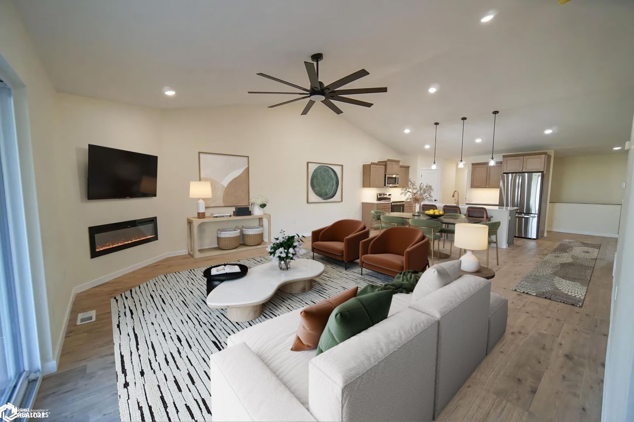 Welcome to this stunning new construction offering a bright, open floor plan with soaring vaulted ceilings. The modern kitchen is the heart of the home, featuring a large island with quartz countertops, a pantry, and stainless steel appliances?perfect for both everyday living and entertaining. The spacious living room opens to a sliding glass door leading to a covered concrete patio and is anchored by a cozy electric fireplace. The primary suite boasts vaulted ceilings, a walk-in closet, and a full private bath. An additional bedroom and full bathroom are conveniently located on the main level. The finished lower level expands your living space with a comfortable family room, two additional bedrooms with egress windows, and a bonus finished area ideal for a home office, hobby space, or extra storage. Brand new, thoughtfully designed, and move-in ready?this home offers modern comfort with flexible living spaces throughout. *Builder to include one (1) year of maintenance beginning at closing, including snow removal and lawn care. Buyer may still customize select finishes and upgrades at additional cost, such as cabinetry above laundry, locker system, and other options, subject to availability.*